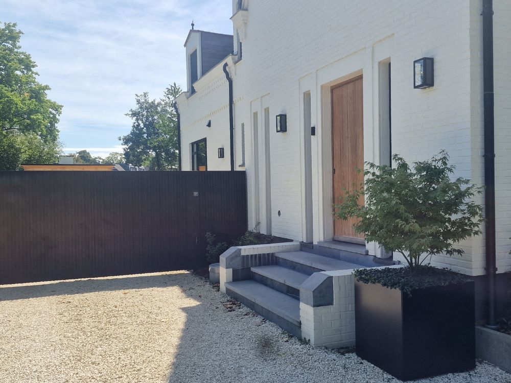 Corten tērauda pergola tuvu jūsu celiņam vai pie ieejas tūliņ piesaista uzmanību. Tā piešķir papildu augstumu un piešķir jūsu priekšējam dārzam modernu un sakārtotu izskatu.