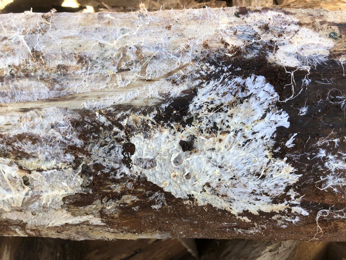 Pelējuma piemērs uz malkas. Ja tu skaidri redzi pelējumu uz malkas, izmet to. Šī malkas nav piemērota dedzināšanai. Attēls ņemts no Mapleseed.farm.