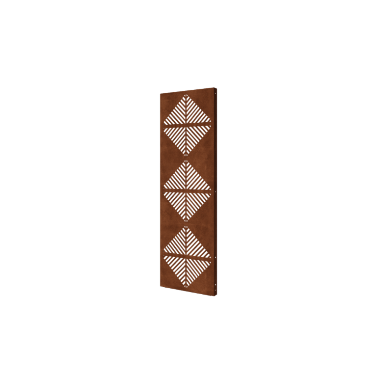 Šis panelis ir izgatavots no augstas kvalitātes Corten-A tērauda, metāla sakausējuma, kas sastāv no dzelzs, vara, fosfora, silīcija, niķeļa un hroma. Unikālā corten tērauda iezīme ir blīvas oksīda ādas veidošanās, kas kalpo kā aizsargājoša rūsas kārta. Šī kārta novērš caurpuvšanu un aizsargā iekšējo materiālu no turpmākas oksidācijas, kamēr korozijas process lēnām turpinās.