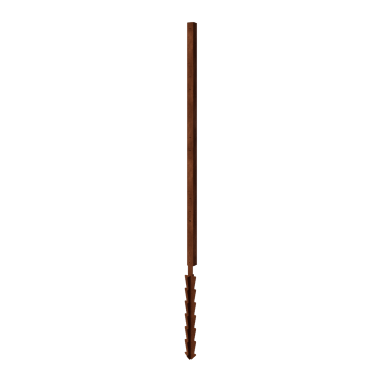 Lai droši nostiprinātu corten tērauda paneļus zemē, izmanto šos stabiņus ar zemes tapu. Tērauda kaste var tikt saliekta leņķī. Mēs stingri iesakām pilnībā ievietot zemes tapu zemē.